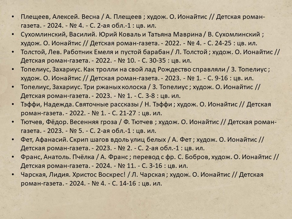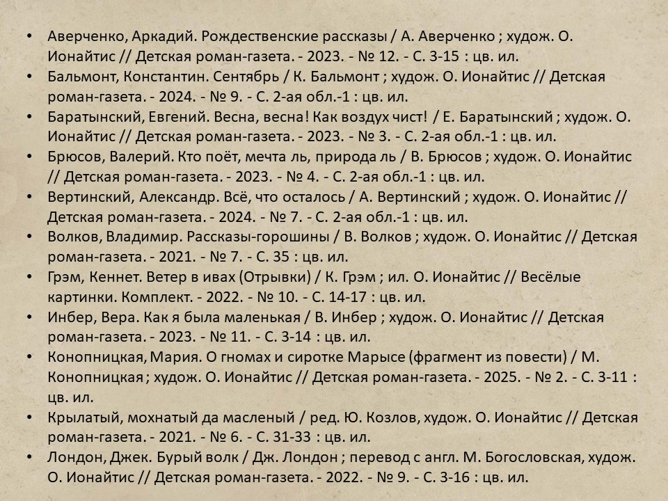 Для каждой новой книги она подбирает свой изобразительный язык и способ работы над материалом. Иногда это просто фантазия, создание сказочных необычных образов, но чаще работа связана с конкретной эпохой, страной, подробно описанными героями. Что требует очень тщательного подбора материала — пейзажей, интерьеров, костюмов, утвари. На этот случай у художницы имеется огромная библиотека, посвященная именно таким вещам. Плюс к ней, конечно же, собственные наблюдения и фотографии. И для крошечных историй, которые Ольга Ионайтис придумывает сама, и превращённые потом в открытки, тоже интересно подбираются необычные моменты натуры: кусочек травы, странное дерево, мох и камни… Подсмотреть и показать красоту мира другим, добавить немного сказки… и тогда все убедительно воплощается на страницах.
